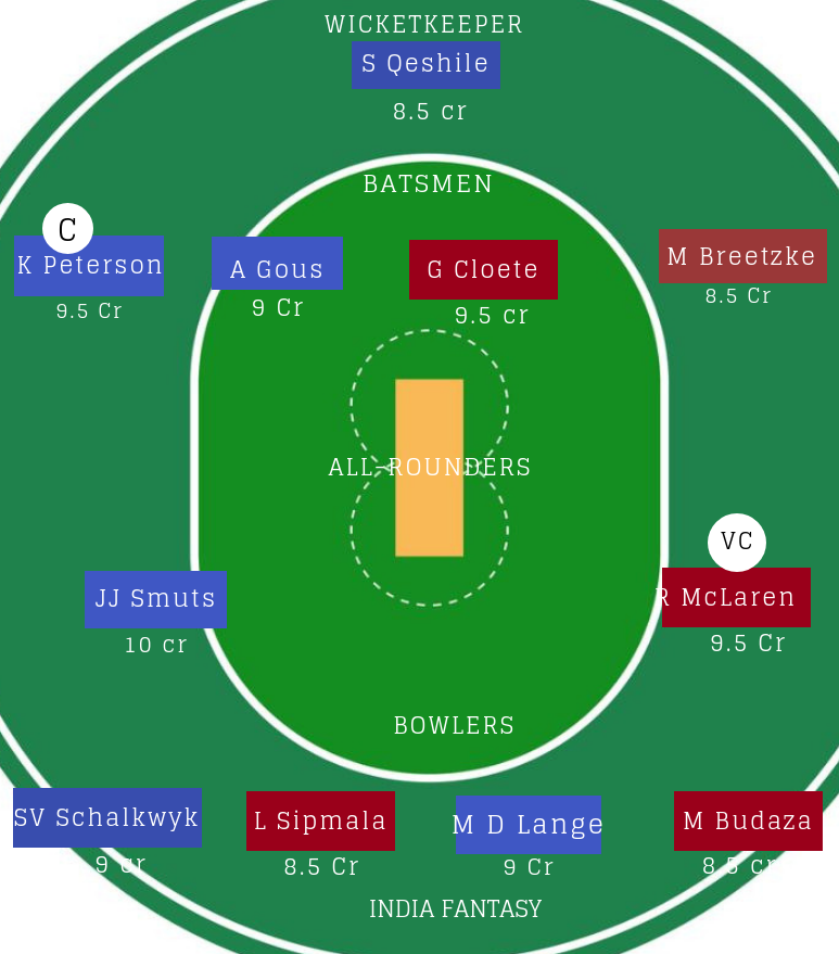 ऑलराउंडर : R McLaren इस टूर्नामेंट में गेंद से कम और बल्ले से लगातार अच्छा प्रदर्शन कर रहे हैं. पिछली दो पारियों में मैकलारेन ने दो पचासे लगाए हैं. JJ Smuts दूसरे ऑलराउंडर हैं. जिन्हें आप टीम में रख सकते हैं.