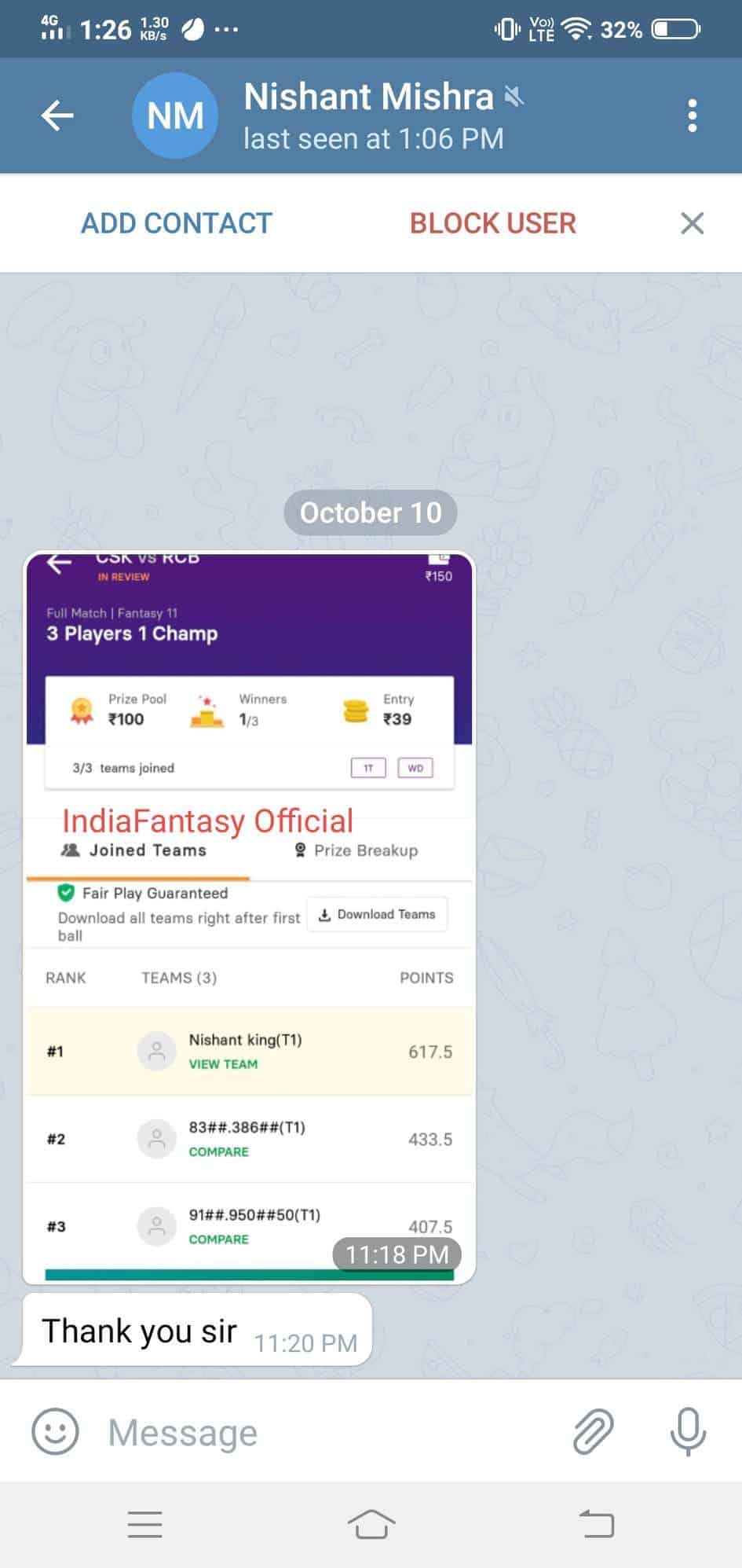IndiaFantasy Official is one of the fastest-growing telegram channels for Dream11 prediction. We pride ourselves as the best Telegram channel for FREE Dream11 fantasy teams.