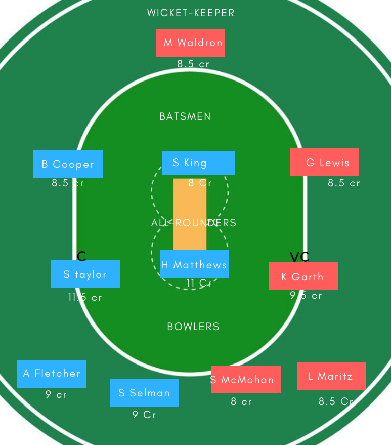 Kim Garth अब तक दो मैचों में 100 प्लस रन जोड़ चुकी हैं. साथ ही दो विकेट भी किम गार्थ के नाम है. ऐसे में कप्तान या उपकप्तान आप किम गार्थ को बना सकते हैं.