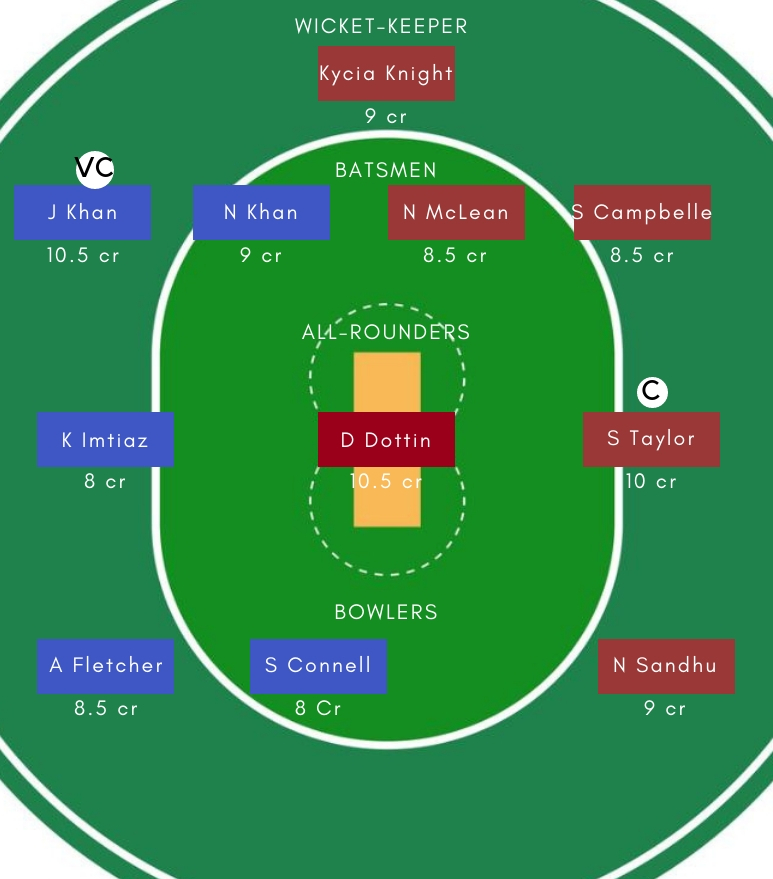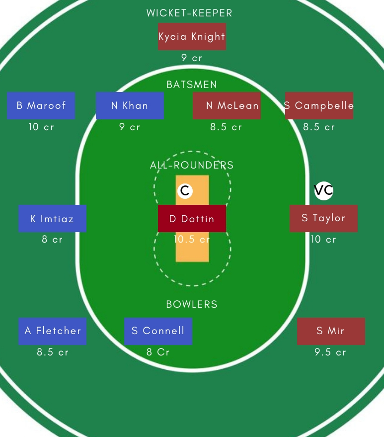 विकेटकीपर – विकेटकीपर के तौर पर Kycia Knight सबसे अच्छी विकल्प होगी। हालांकि पहले वनडे में वो कुछ खास नहीं कर सकी थी। लेकिन वो अपना दिन होने पर किसी भी गेंदबाजी अटैक की धज्जियां उड़ा सकती है।