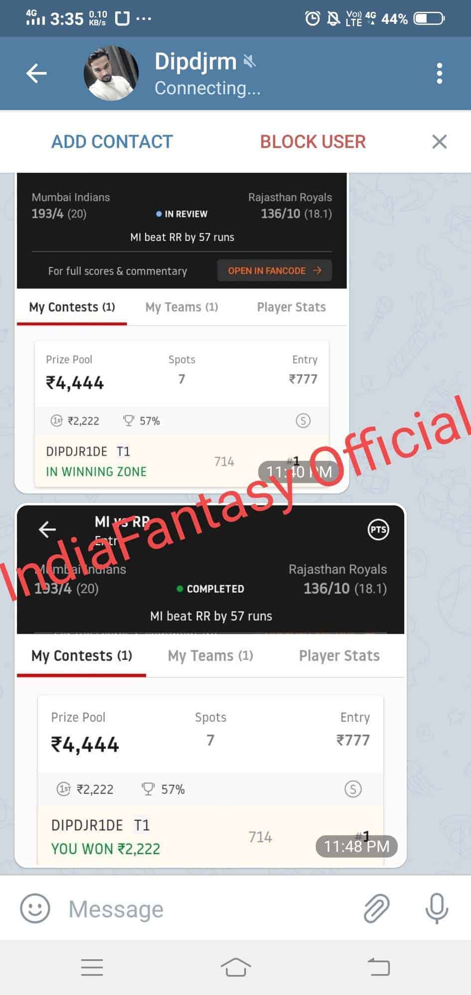 IndiaFantasy Official is one of the fastest-growing telegram channels for Dream11 prediction. We pride ourselves as the best Telegram channel for FREE Dream11 fantasy teams.