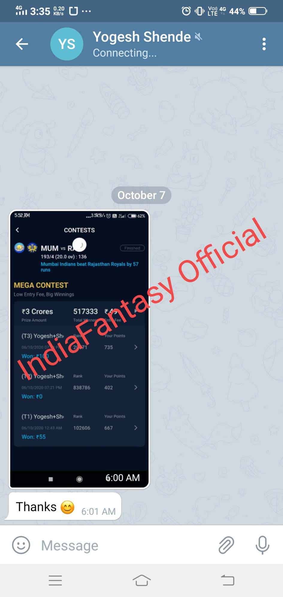 Our winning streak in the Dream11 IPL 2020 continued in yesterday’s game also and our teams performed exceptionally well in SL as well as GL. Here are the winning screenshot shared by our happy telegram subscribers-
