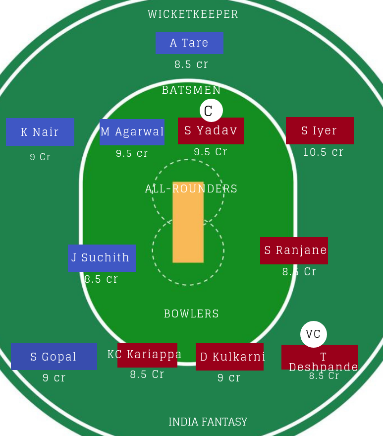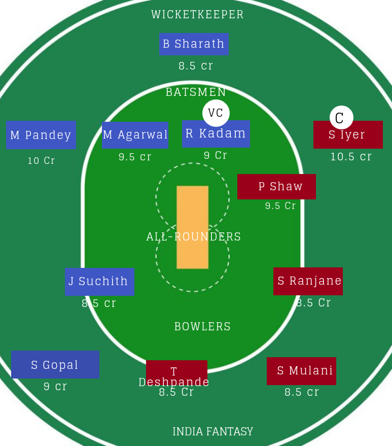 बल्लेबाज : Manish pandey ने 6 पारियों में 260 रन बनाए हैं. वहीं, Rohan Kadam के बल्ले से 340 रन निकले हैं. Shreyas Iyer 350 रन बना चुके हैं, जिसमें दो शतक भी शामिल है. S Yadav को टीम में शामिल करें. इस छोटे प्रारूप में सूर्यकुमार बढ़िया बल्लेबाजी करते हैं. अब तक 273 रन बनाए हैं. Karun Nair और Prithvi shaw को भी शामिल कर सकते हैं.
