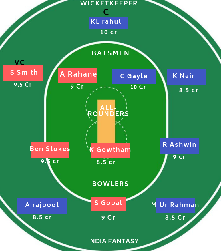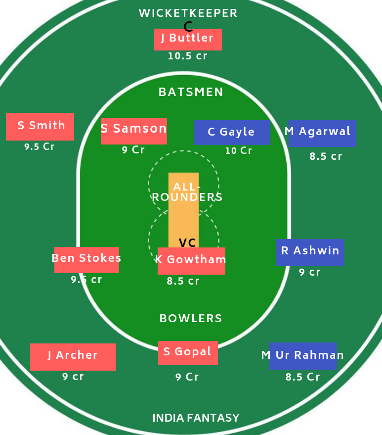 बल्लेबाज : S Smith के साथ आप Sanju Samson को ले सकते हैं. A Rahane फॉर्म में नहीं हैं. इसलिए, उनसे पहले संजू सैमसन को प्राथमिकता दी है. Chris Gayle और mayank Agarwal की मौजूदगी से फैंटसी टीम की बल्लेबाजी काफी मजबूत लग रही है.