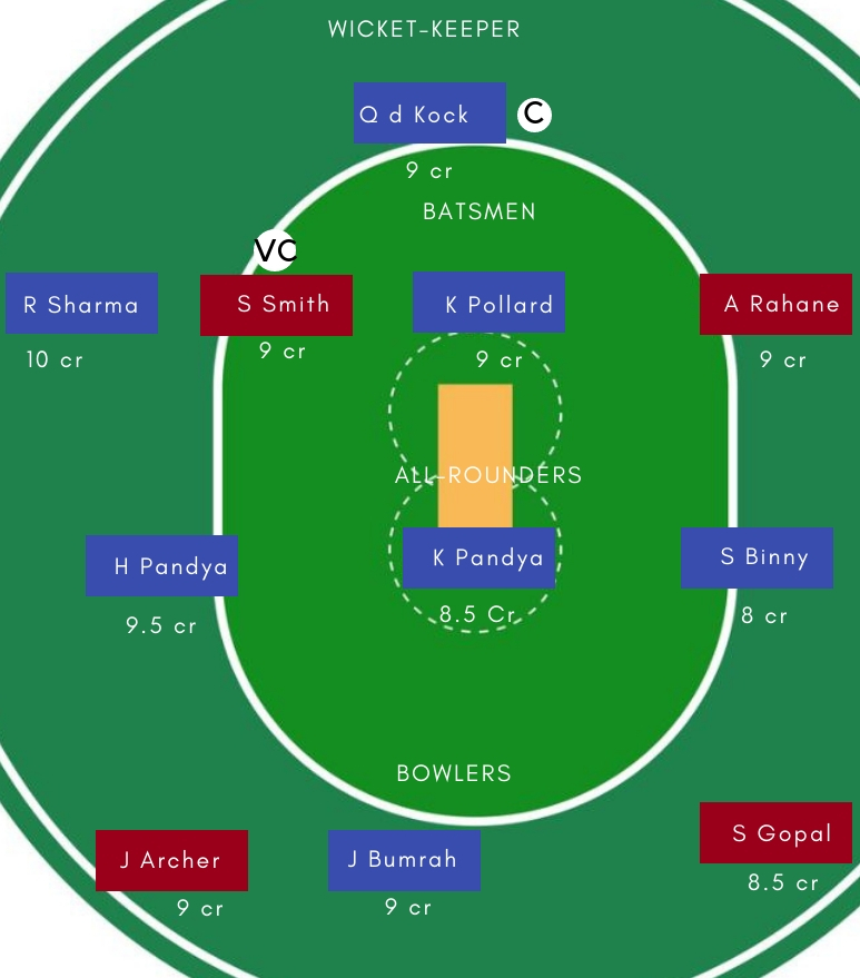 ऑलराउंडर – ऑलराउंडर के तौर पर Hardik Pandya, Krunal Pandya, S Binny सबसे अच्छे विकल्प होंगे। Hardik Pandya ने फिनिशर की भूमिका को बखूबी निभाया है। Pandya इस सीजन 8 मैचों में 218 रन बना चुके है। जबकि उन्होने 8 विकेट भी अपने नाम किए है। Krunal Pandya ने पिछले मैच में 37 रनों की बेशकीमती पारी खेली थी।