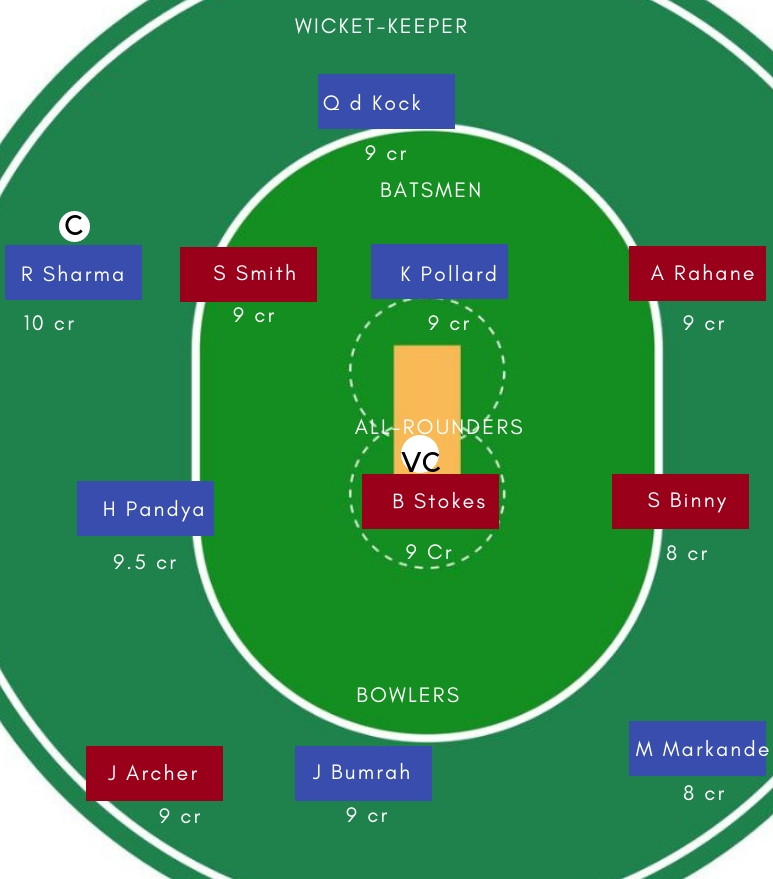 गेंदबाज – गेदबाजी में Jasprit Bumrah, Rahul Chahar, Jofra Archer, Shreyas Gopal सबसे अच्छे विकल्प होंगे। Jofra Archer इस सीजन 8 मैचों में 10 विकेट चटका चुके है। जबकि पिछले मैच में उन्होने महज 15 रन देकर 3 विकेट अपने नाम किए थें। Rahul Chahar ने 6 मैचों में 6 विकेट लिए है। लेकिन उनका इकॉनमी 7 से नीचा का रहा है। पिछले मैच में Rahul ने 19 रन देकर 3 विकेट चटकाए थें।