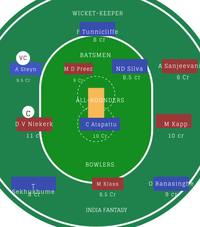 बल्लेबाज : A Steyn ने पिछले मुकाबले में 75 रनों की बेहतरीन पारी खेली थी. वहीं, M D Preez को ले सकते हैं. वहीं, ND Silva और A Sanjeevani को श्रीलंका की तरफ से टीम में शामिल कर सकते हैं.