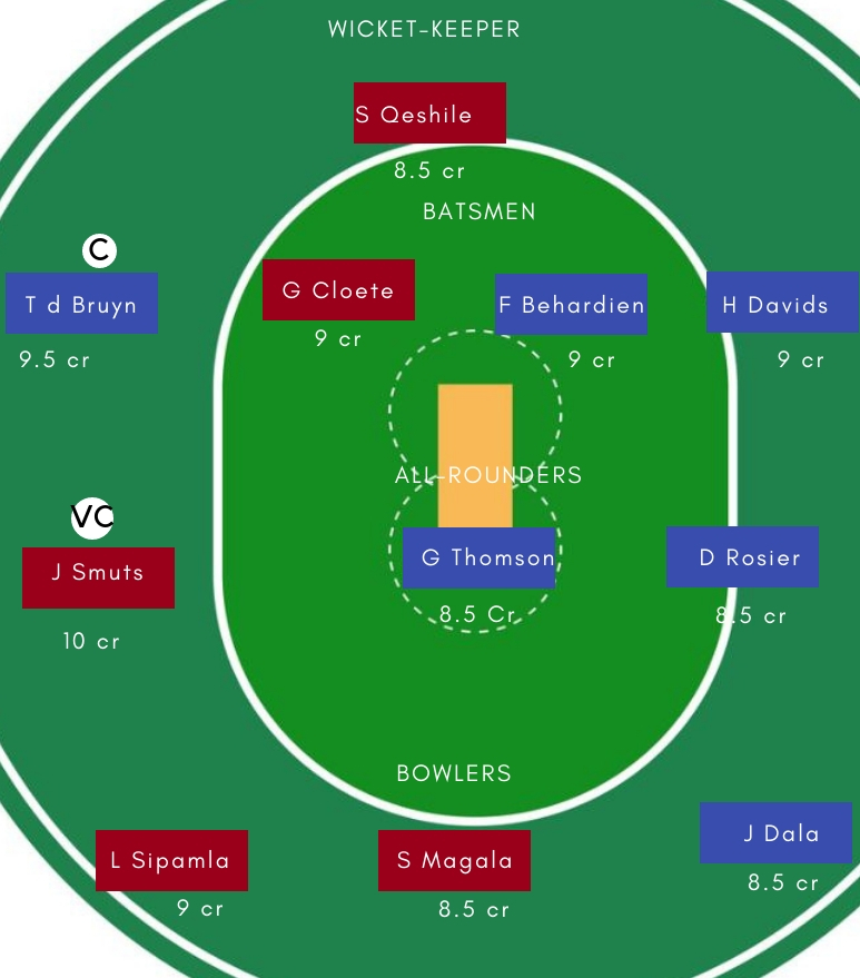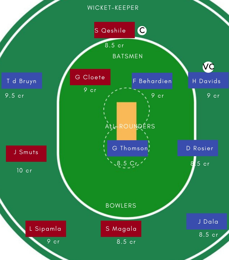 गेंदबाज – गेदबाजी में L Sipamla, S Magala, Shaun von Berg, Junior Dala सबसे अच्छे विकल्प होगें। Sipamla ने पिछले कुछ समय में गेंद से दमदार प्रदर्शन किया है। वही, Junior Dala ने मोमेंटम के सेमीफाइनल और फाइनल मुकाबलें में शानदार गेंदबाजी की थी।