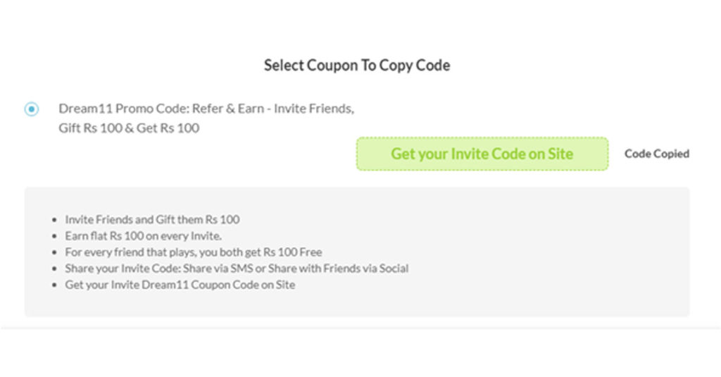 Dream11 gives Rs.100 cash bonus after every referral. You can simply apply the referral code and earn flat 100 for every invite. When your friend starts playing, you both get Rs 100 free.
