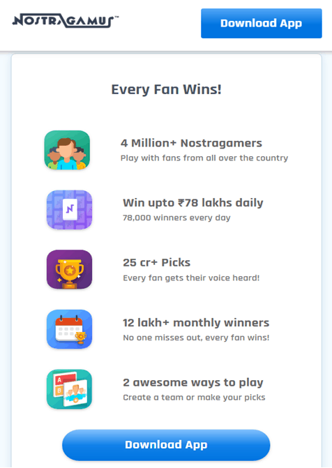 Nostra Pro App does work on prediction, but of different sorts. Rather than focusing on selecting the best combined eleven, Nostra Pro App asks the user questions related to a number of runs a batsman would score or the number of wickets a bowler will take etc.