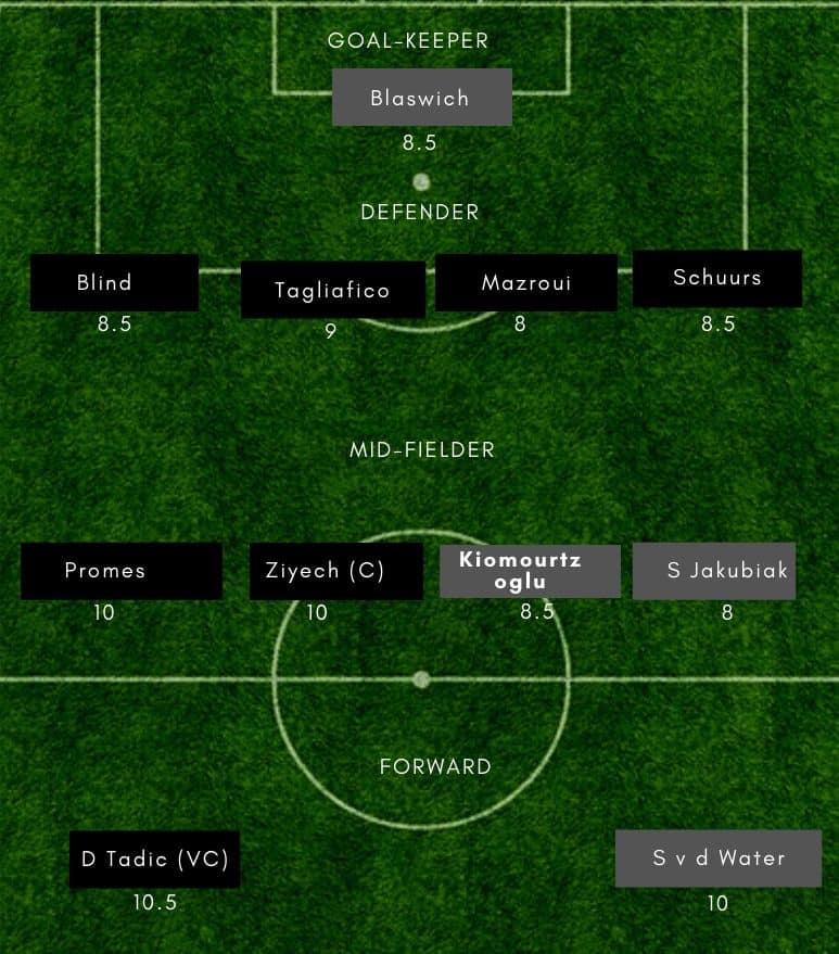 Ajax XI: Onana (GK), Tagliafico, Blind, Schuurs, Mazraoui, Martinez, Beek, Ziyech, Promes, Tadic, Huntelaar