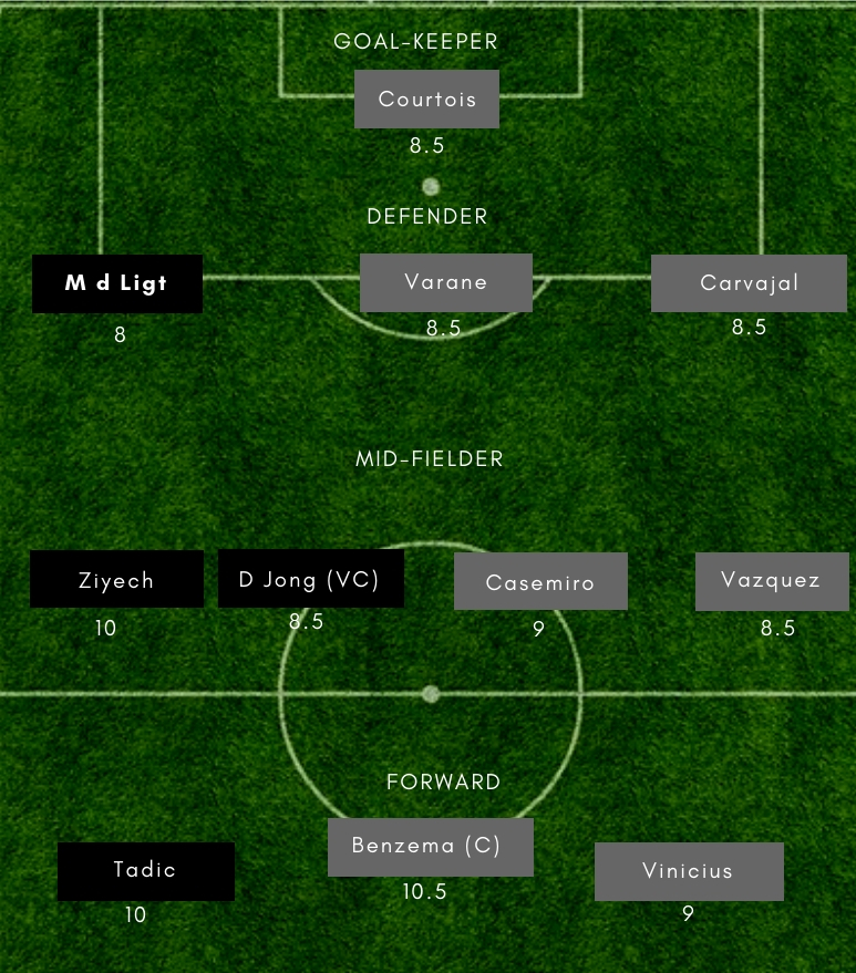 AJA vs RM Dream11 Playing 11 – (Probable) – Real Madrid– Courtois (GK), Carvajal, Varane, Nacho, Reguilon; Casemiro, Modric, Kroos; Vinicius, Benzema, Lucas Ajax– Onana (GK), Mazraoui, De Ligt, Blind, Tagliafico; De Jong, Schone; Neres, Van de Beek, Ziyech, Tadic
