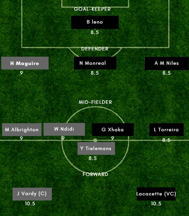 ARS vs LEI Dream11 Playing 11 – (Probable) – Leicester City– Schmeichel (GK), Pereira, Evans, Maguire, Chilwell, Ndidi, Tielemans, Maddison, Barnes, Gray, Vardy Arsenal– Leno (GK), Mustafi, Koscielny, Sokratis, Kolasinac, Maitland-Niles, Torreira, Guendouzi, Xhaka, Iwobi, Lacazette