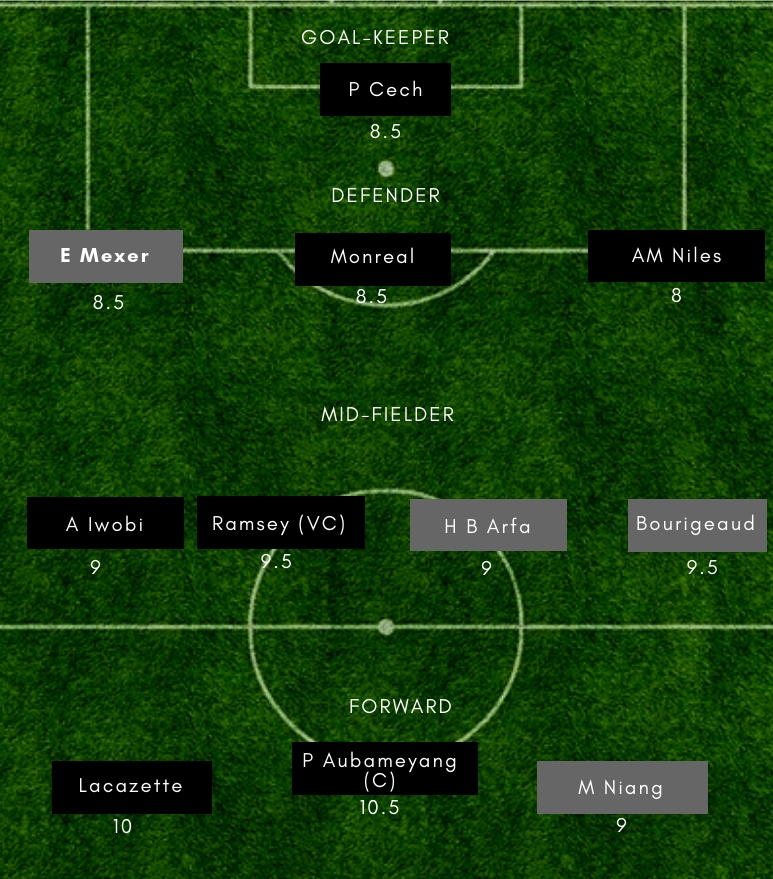 Arsenal– Cech (GK), Maitland-Niles, Mustafi, Koscielny, Monreal; Guendouzi, Torreira; Mkhitaryan, Ozil, Iwobi; Aubameyang Rennes– Koubek (GK), Traore, Silva, Mexer, Bensebaini; Sarr, Andre, Grenier, Bourigeaud; Ben Arfa, Hunou