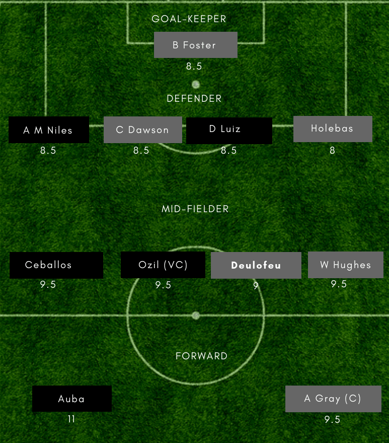 Leno (GK), Maitland-Niles, Sokratis, David Luiz, Kolasinac, Xhaka, Guendouzi, Ceballos, Pepe, Nelson, Aubameyang