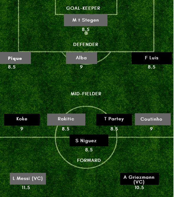 ATL vs BAR Dream11 Playing 11 – (Probable) – Barcelona– Ter Stegen (GK), Alba, Pique, Umtiti, Roberto; Arthur, Busquets, Rakitic; Coutinho, Suarez, Messi Atletico Madrid– Oblak (GK), Luis, Godin, Gimenez; Rodri, Koke, Partay, Saul, Arias, Griezmann, Correa