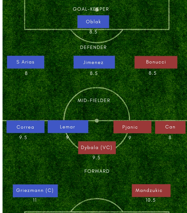 ATL vs JUV Dream11 Playing 11 – (Probable) – Atletico Madrid– Oblak (GK), Arias, Godin, Giménez, Filipe Luis; Correa, Saúl Ñíguez, Rodri, Lemar; Griezmann, Costa Juventus– Szczesny (GK), Cancelo, Bonucci, Chiellini, A. Sandro, Bentancur, Pjanic, Matuidi, Dybala, Ronaldo, Mandzukic