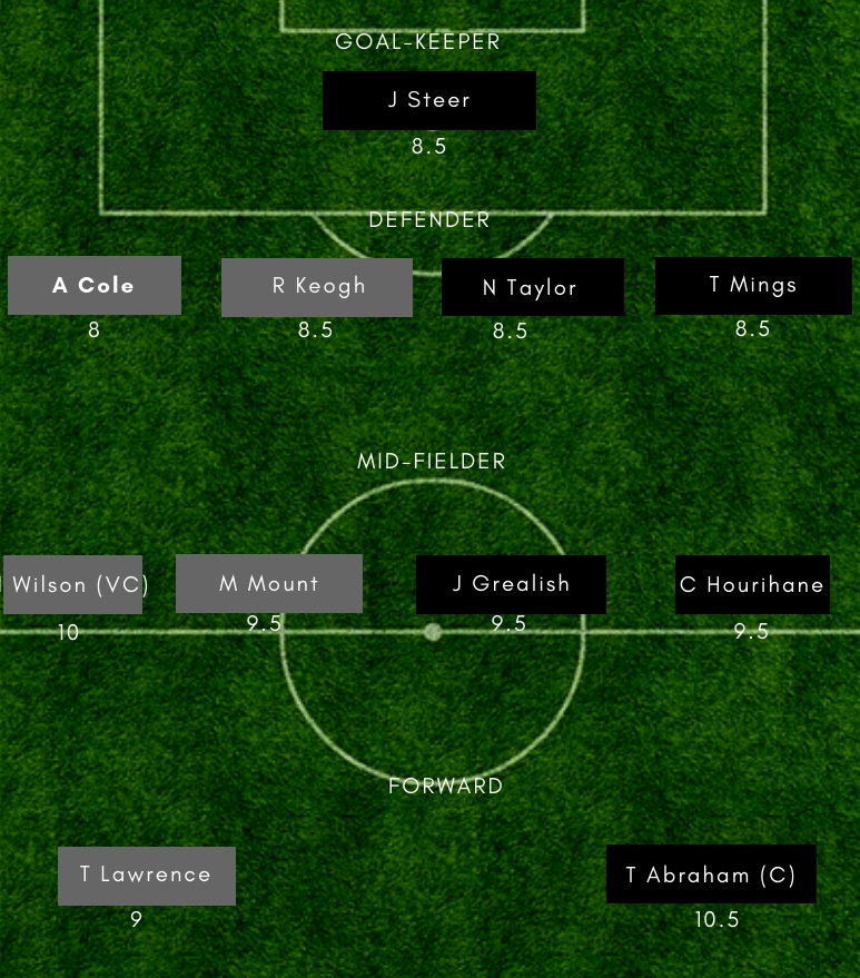 Goalkeeper: J Steer Defenders: N Taylor, T Mings, R Keogh, A Cole Midfielders: J Grealish, C Hourihane, H Wilson (VC), M Mount Forwards: Abraham (C), T Lawrence