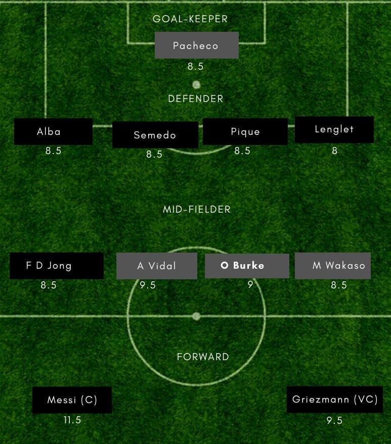 Barcelona: Ter Stegen (GK), Nelson Semedo, Gerard Piqué, Clement Lenglet, Jordi Alba, Arturo Vidal, Ivan Rakitic, Frenkie De Jong, Lionel Messi, Luis Suárez, Antoine Griezmann Deportivo Alaves: Fernando Pacheco (GK), Ximo Navarro, Rodrigo Ely, Victor Laguardia, Ruben Duarte, Pere Pons, Manu García, Mubarak Wakaso, Aleix Vidal, Lucas Pérez, Oliver Burke