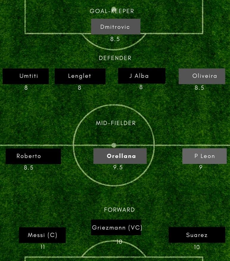 Ter Stegen (GK), Semedo, Todibo, Lenglet, Alba, De Jong, Vidal, Arthur, Messi, Suarez, Griezmann