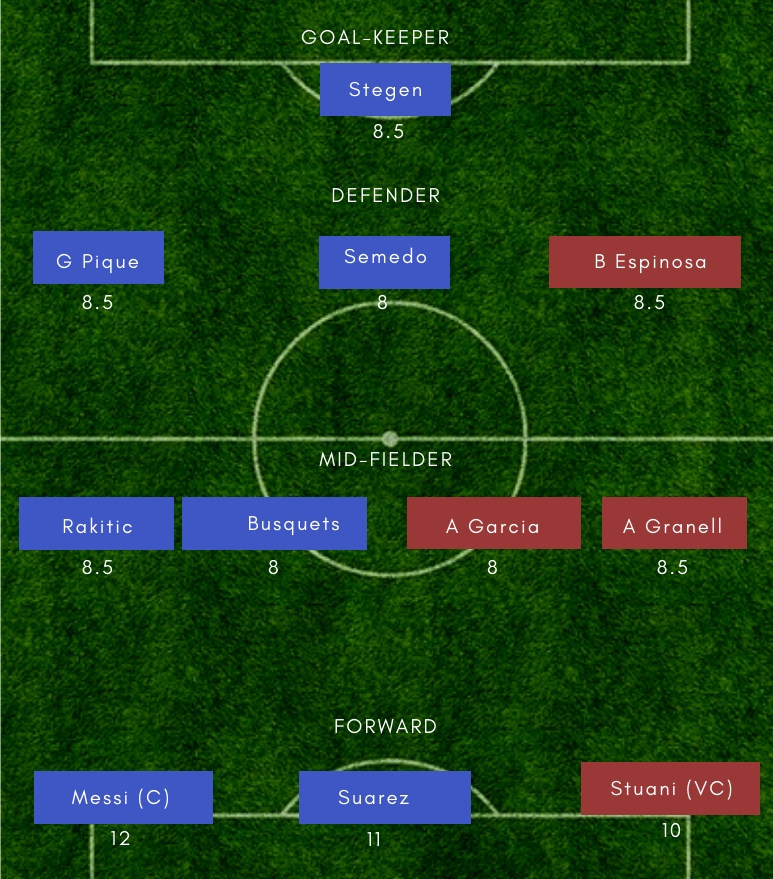 BAR vs GIR Dream11 Playing 11 – (Probable) – Girona– Bounou (GK), Alcala, Espinosa, Juanpe; Porro, Pons, A Garcia, Valery; Portu, Stuani, Lozano Barcelona Barcelona– Ter Stegen (GK), Roberto, Pique, Vermaelen, Alba; Rakitic, Busquets, Arthur; Coutinho, L Suarez, Messi