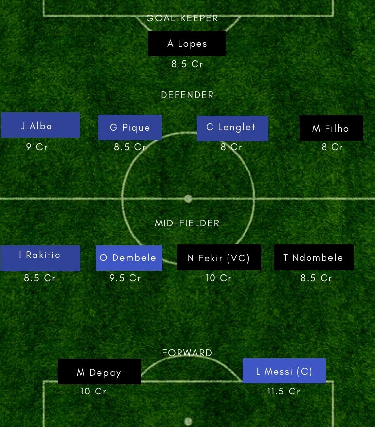 Barcelona – Ter Stegen; Semedo, Pique, Lenglet, Alba; Busquets, Rakitic, Arthur; Dembele, L Suarez, Messi