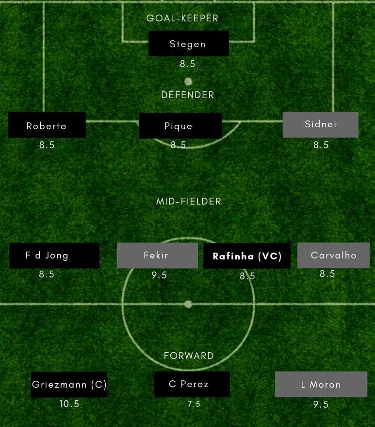 Ter Stegen (GK), Semedo, Pique, Todibo, Alba; Busquets, De Jong, Puig, Perez, Rafinha, Griezmann