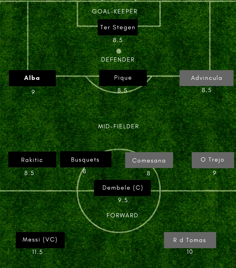 Barcelona– Stegen (GK), Semedo, Pique, Umtiti, Alba, Arthur, Rakitic, Vidal, Messi, Coutinho, Suarez Rayo Vallecano– Stole Dimitrievski (GK), Amat, Galvez, Velaquez, Moreno, Suarez, Comesana, Advincula, Embarba, Trejo, Tomas