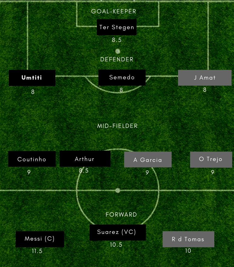 Note: Samuel Umtiti will be partnering Gerard Pique at the back. Midfielder Arthur has been declared full fit and could feature here. Key Players – Messi, Suarez