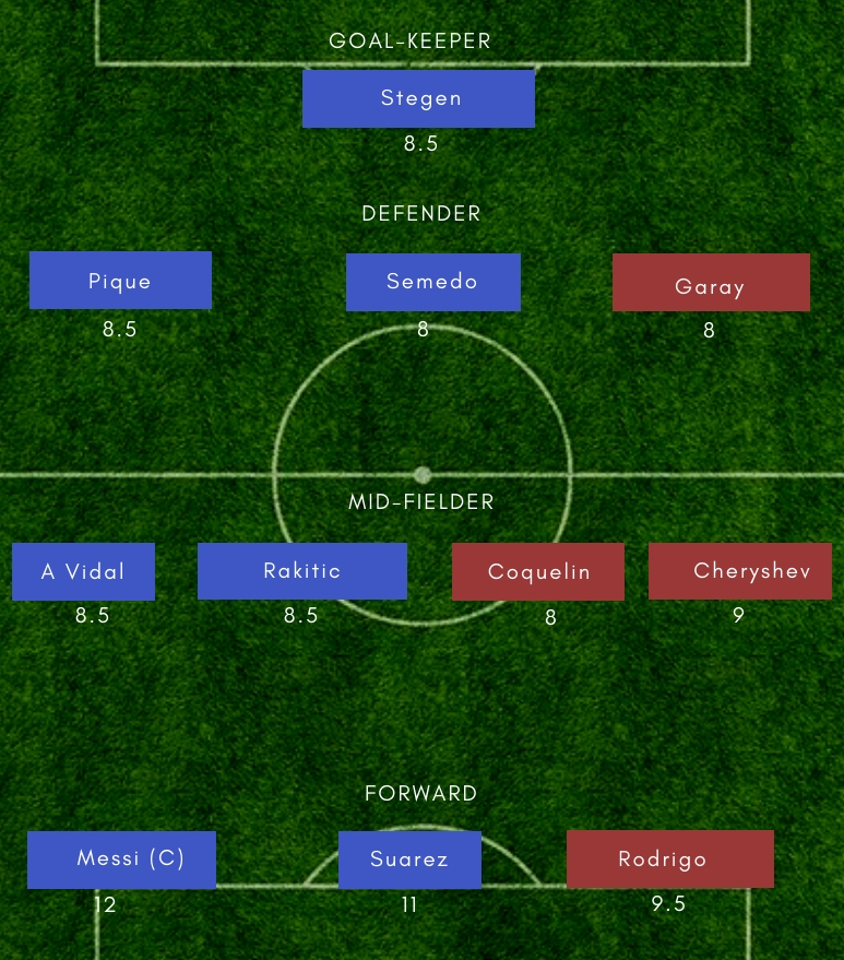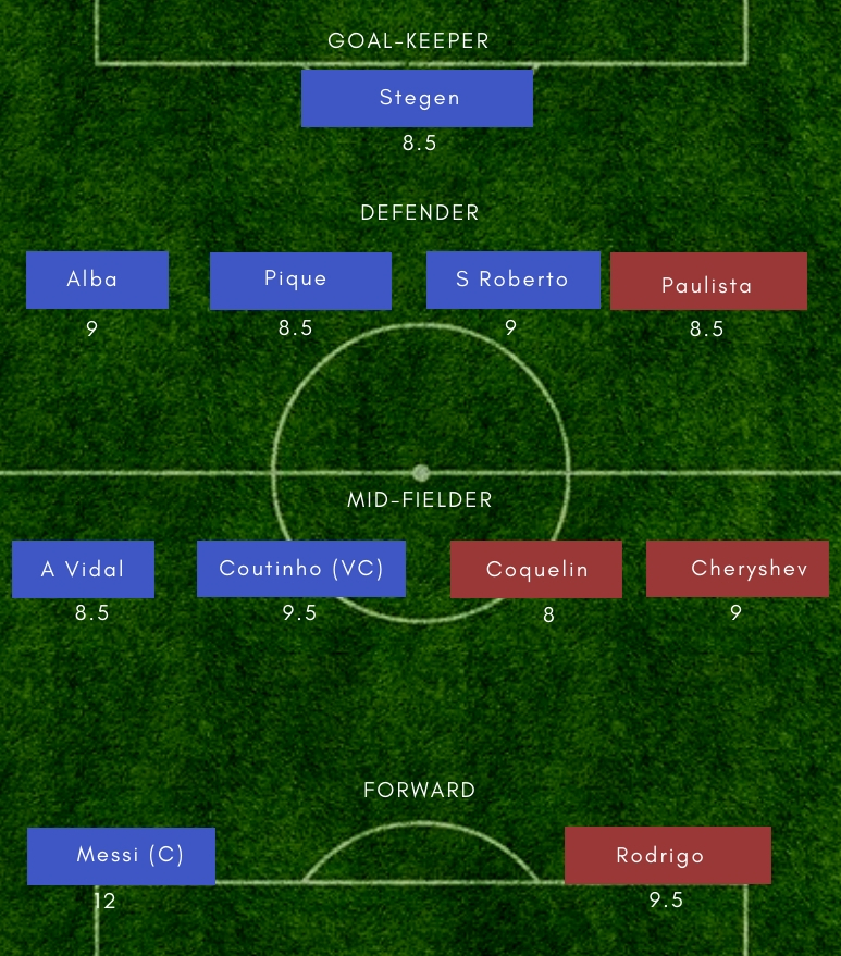 BAR vs VAL Dream11 Playing 11 – (Probable) – Barcelona– Ter Stegen (GK), Semedo, Pique, Lenglet, Alba; Vidal, Arthur, Rakitic; Messi, Suarez, Coutinho Valencia– Neto (GK), Piccini, Paulista, Garay, Gaya; Soler, Parejo, Coquelin, Cheryshev; Moreno, Mina
