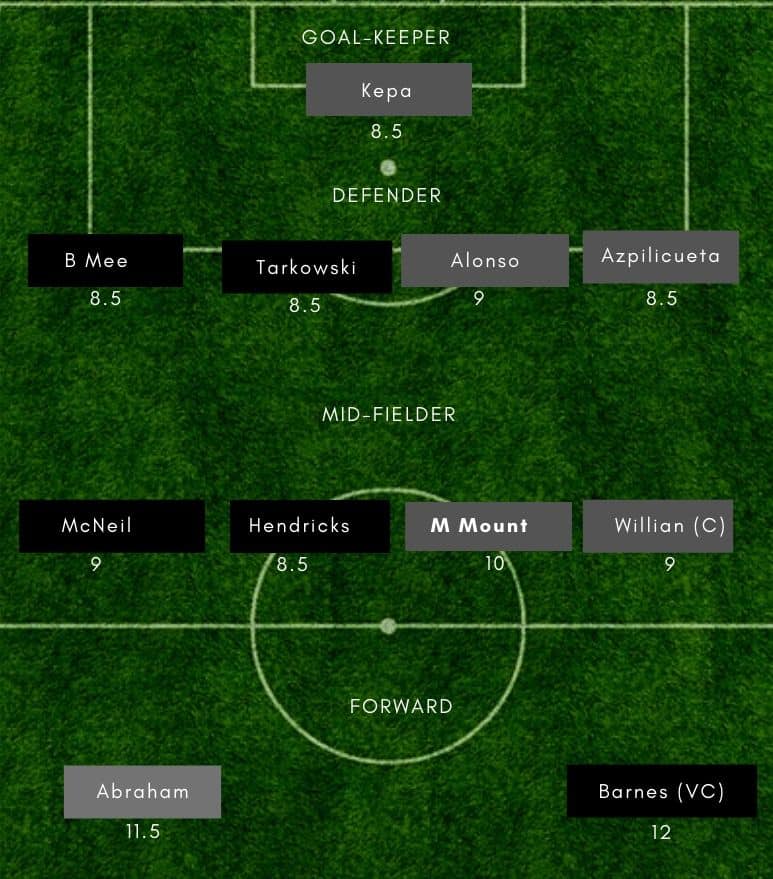 Arrizabalaga (GK), Alonso, Tomori, Zouma, Azpilicueta, Kovacic, Jorginho, Pulisic / Odoi, Mount, Willian, Abraham