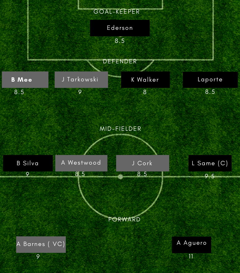 BUR vs MCI Dream11 Playing 11 – (Probable) – Burnley– Heaton (GK), Lowton, Tarkowski, Mee, Taylor, Hendrick, Westwood, Cork, McNeil, Wood, Barnes Manchester City– Ederson (GK), Walker, Laporte, Stones / Kompany, Mendy, Gundogan, David Silva, Bernardo Silva, Leroy Sane, Sterling, Aguero