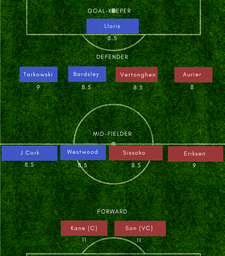 Tottenham Hotspurs– Lloris (GK), Trippier, Alderweireld, Vertonghen, Rose, Sissoko, Dier, Winks, Eriksen, Lucas, Son