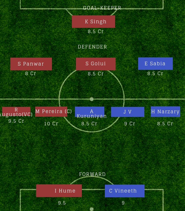 Karanjit Singh (GK), Tondonba Singh, Eli Sabia, Zohmingliana Ralte, Laldinliana Renthlei, Germanpreet Singh, Raphael Augusto (C), Halicharan Narzary, Andrea Orlandi, Gregory Nelson, CK Vineeth.