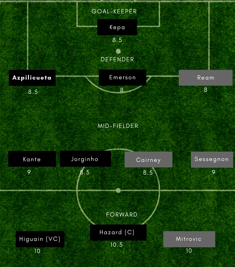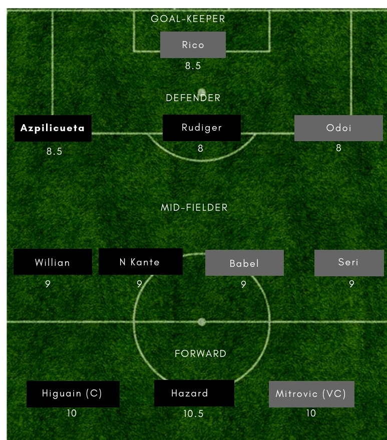 CHE vs FUL Dream11 Playing 11 – (Probable) – Fulham– Rico (GK), Odoi, Ream, Le Marchand, Christie, Bryan, Chambers, Sari, Sessegnon, Babel, Mitrovic Chelsea– Kepa (GK), Emerson, David Luiz, Rudiger, Azpilicueta, Jorginho, Kante, Barkley, Pedro, Hazard, Higuain