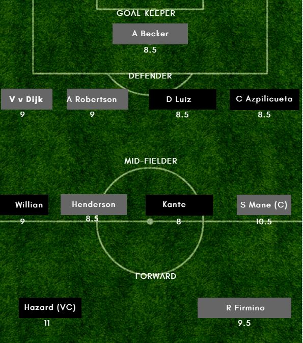 Liverpool– Alisson (GK), Alexander-Arnold, Lovren, Van Dijk, Robertson; Henderson, Fabinho, Keita; Salah, Firmino, Mane