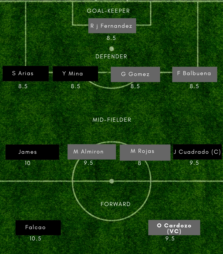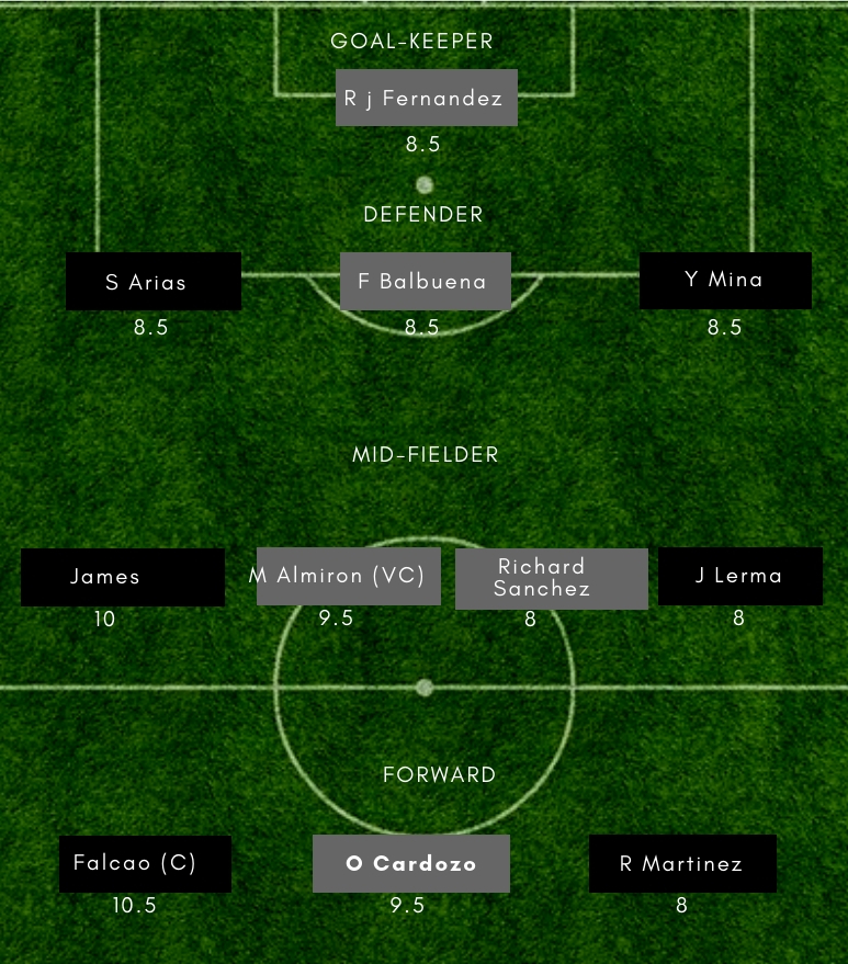 Oscar Cardozo – 11 Roger Martinez – 10.5 Duvan Zapata – 9 Miguel Almiron – 16 James Rodriguez – 10