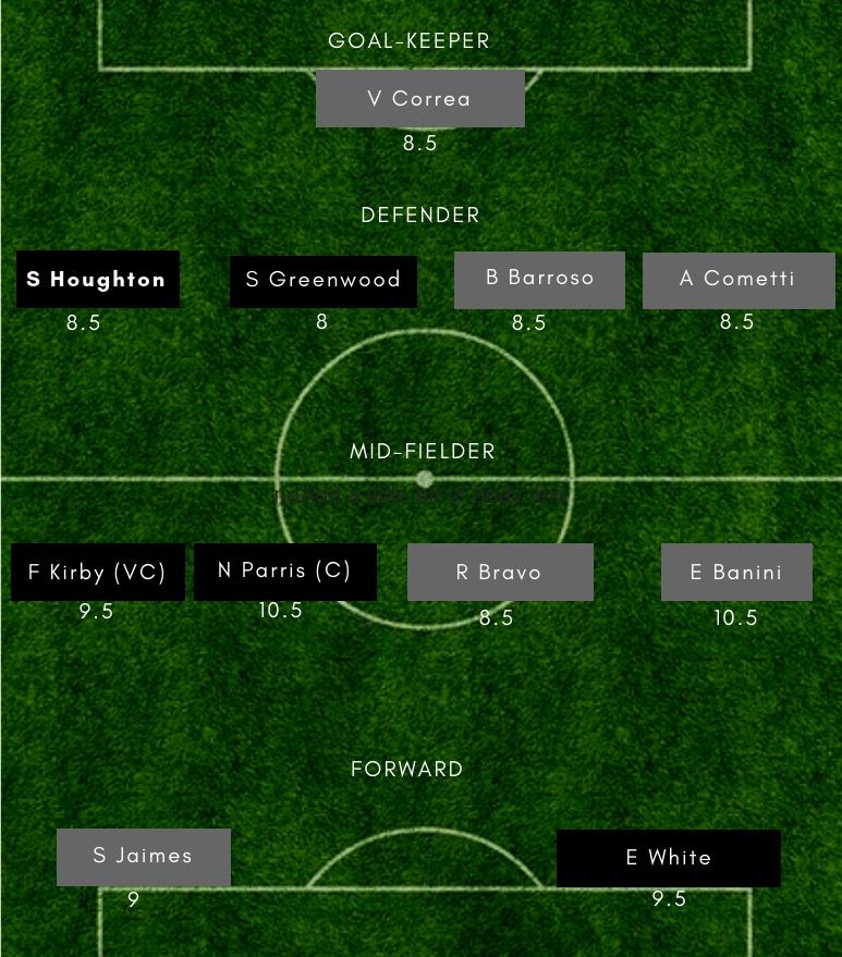 Ellen White: 12.5 Sol Jaimes: 4 Nikita Parris: 11.5 Fran Kirby: 13.5 Estefania Banini: 4.5 Aldana Cometti: 8 Agustin Barroso: 8