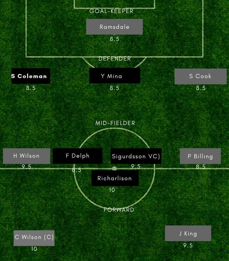 Pickford (GK), Coleman, Yerry Mina, Michael Keane, Lucas Digne, Fabian Delph, Andre Gomez, Alex Iwobi, Gylfi Sigurdsson, Richarlison, Moise Keane