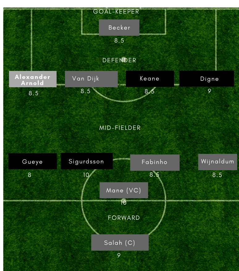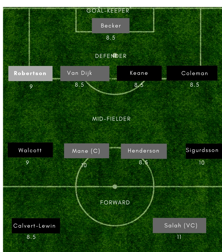 EVE vs LIV Dream11 Playing 11 – (Probable) – Everton– Pickford (GK), Coleman, Keane, Zouma, Digne; Gueye, Schneiderlin; Walcott, Sigurdsson, Richarlison; Calvert-Lewin Liverpool– Alisson (GK), Alexander-Arnold, Matip, Van Dijk, Robertson, Fabinho, Henderson, Wijnaldum, Salah, Mane, Origi