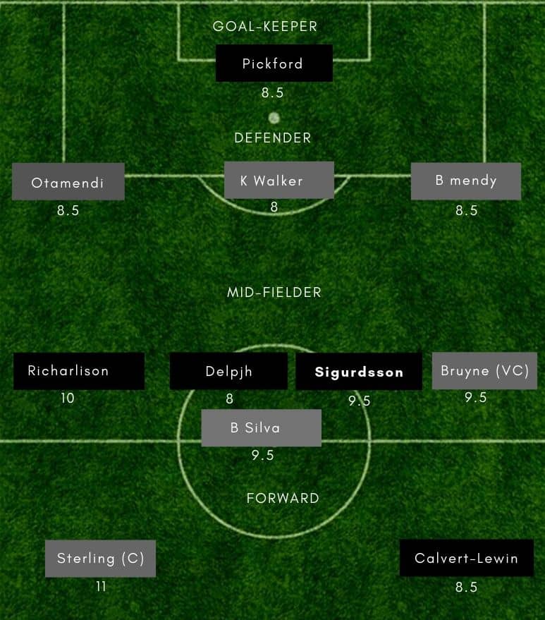 Jordan Pickford (GK), Lucas Digne, Micheal Keane, Yerry Mina, Seamus Coleman, Tom Davies, Gylfi Sigurdsson, Fabian Delph, Bernard, Alex Iwobi, Dominic Calvert-Lewin