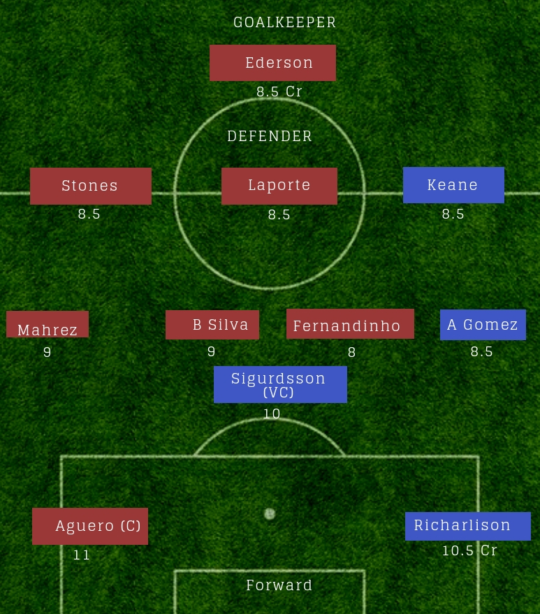 Manchester City– Ederson (GK), Danilo, Stones, Laporte, Delph, B. Silva, Fernandinho, D. Silva, Mahrez, Aguero, Sane