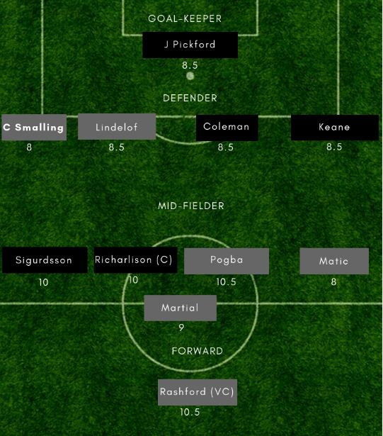 EVE vs MUN Dream11 Playing 11 – (Probable) – Everton– Pickford (GK), Coleman, Keane, Zouma, Digne, Gueye, Schneiderlin, Richarlison, Sigurdsson, Bernard, Calvert-Lewin Manchester United– De Gea (GK), Dalot, Smalling, Lindelof, Young, Matic, Pogba, Fred; Lingard; Lukaku, Rashford