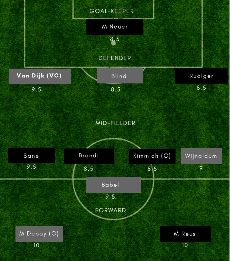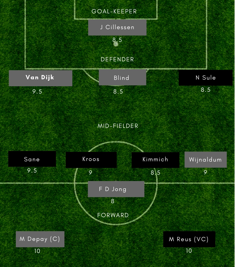 GER vs NED Dream11 Playing 11 – (Probable) – Nederlands– Cillessen (GK), Dumfries, De Ligt, Van Dijk, Blind; De Roon, De Jong; Promes, Wijnaldum, Babel; Depay Germany– Neuer (GK), Kehrer, Rudiger, Sule, Halstenberg; Kroos, Goretzka, Gundogan; Gnarby, Werner, Sane