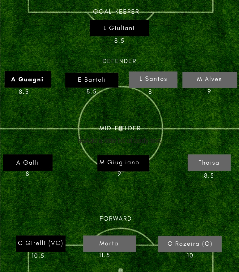 Cristiane Rozeira – 37.5 Cristiana Girelli – 31 Barbara Bonansea – 30 Aurora Galli – 21.5 Manuela Giugliano – 23 Andressa Alves – 13 Leticia Santos – 15.5
