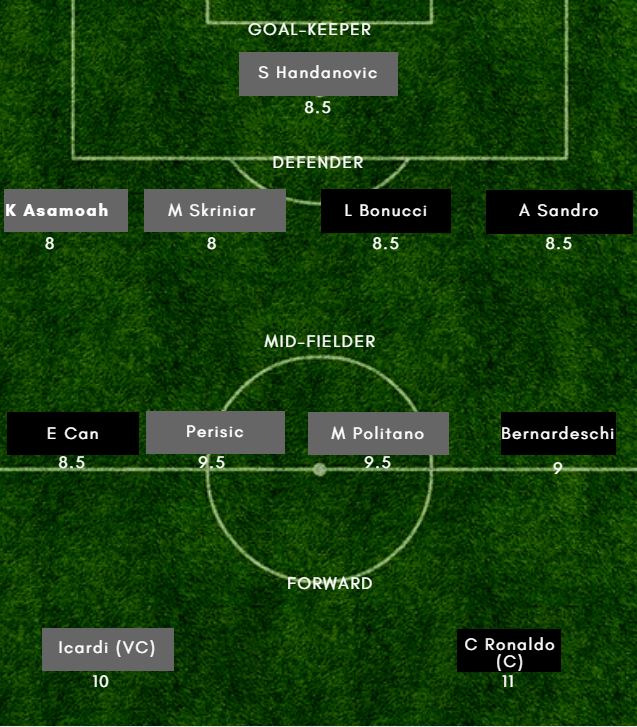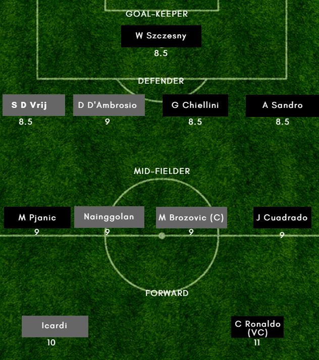 JUV vs INT Dream11 Playing 11 – (Probable) – Inter Milan– Handanovic (GK), D’Ambrosio, De Vrij, Skriniar, Asamoah, Vecino, Gagliardini, Politano, Radja Nainggolan, Ivan Perisic, Mauro Icardi Juventus– Szczesny (GK), Cancelo, Rugani, Bonucci, Sandro, Can, Bentancur, Matuidi / Emre Can, Bernardeschi, Ronaldo, Moise Kean