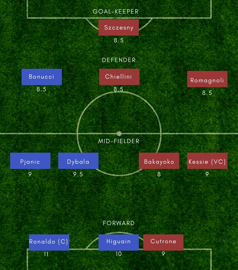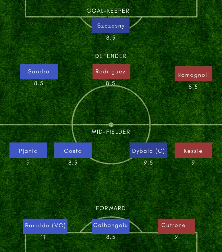 JUV vs MIL Dream11 Playing 11 – (Probable) – Juventus– Szczesny (GK), De Sciglio, Bonucci, Chiellini, Sandro; Bentancur, Pjanic, Matuidi; Dybala, Ronaldo, Costa AC Milan– Donnarumma (GK), Calabria, Zapata, Romagnoli, Rodriguez; Calhanoglu, Kessie, Bakayoko, Paqueta; Higuain, Cutrone