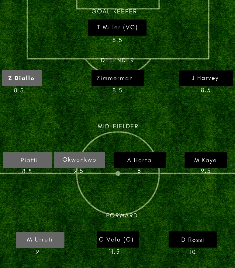 Goalkeeper: T Miller (VC) Defenders: Z Diallo, W Zimmerman, J Harvey Midfielders: I Piatti, O Okwonkwo, A Horta, M Kaye Forwards: M Urruti, Carlos Vela (C), D Rossi