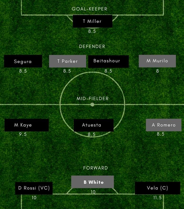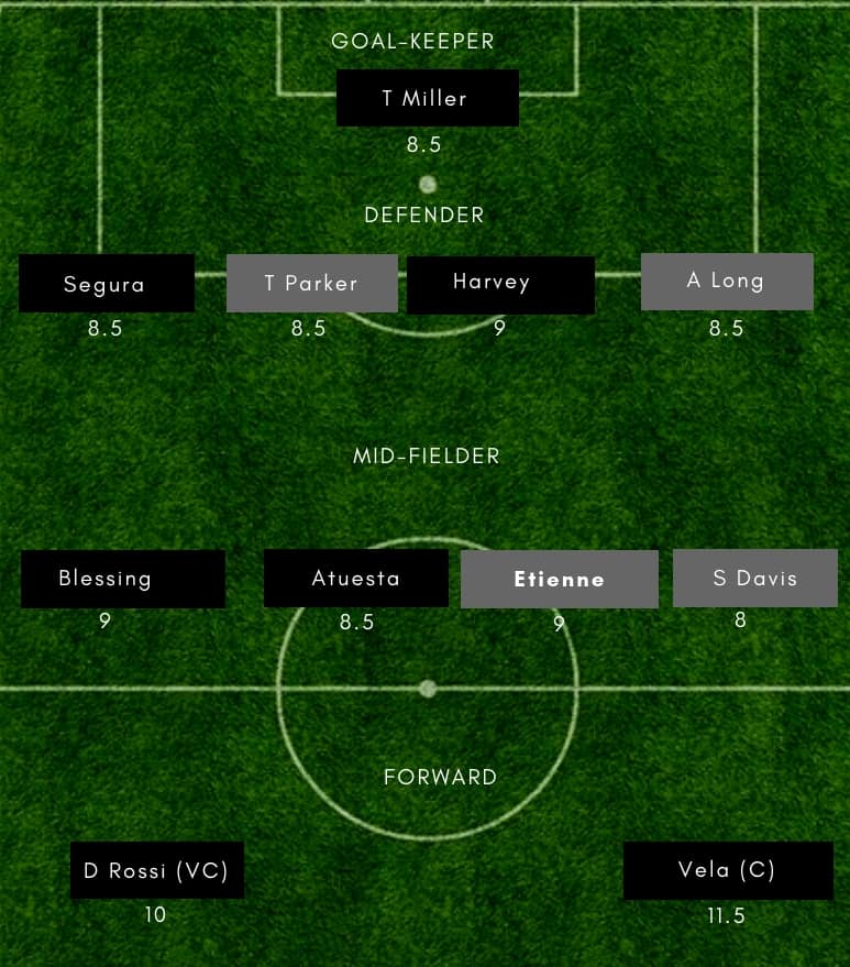 Miller (GK), Harvey, Segura, Zimmerman, Beitashour, Atuesta, Blessing, Kaye, Rossi, Vela, Diomande