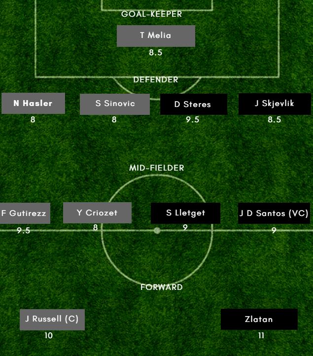 Goalkeeper: D Bingham Defenders: D Steres, J Skjelvik, B Barath, N Hasler Midfielders: J D Santos, J Corona, F Gutierrez, K Rowe Forwards: J Russell (C), Ibrahimovic (VC)
